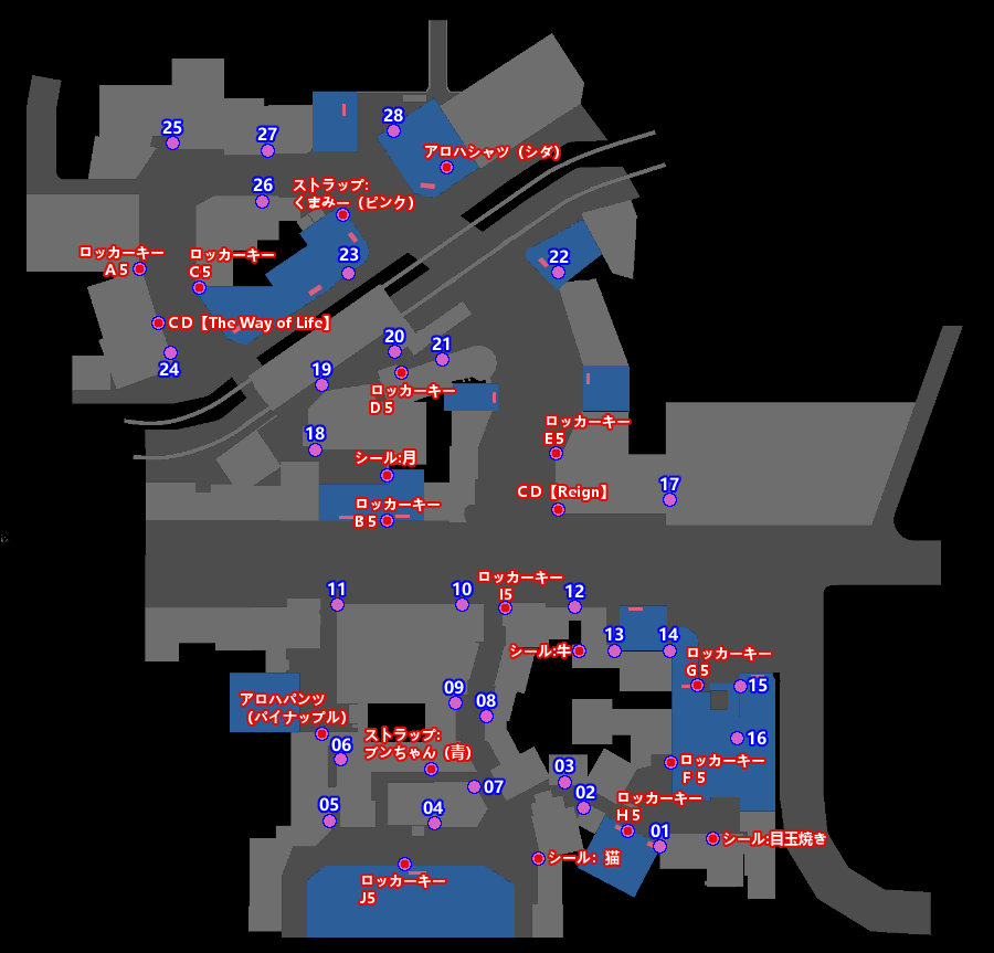 ※ピンク色の丸の中に小さい赤丸があるのが黄色のラブボックスの場所